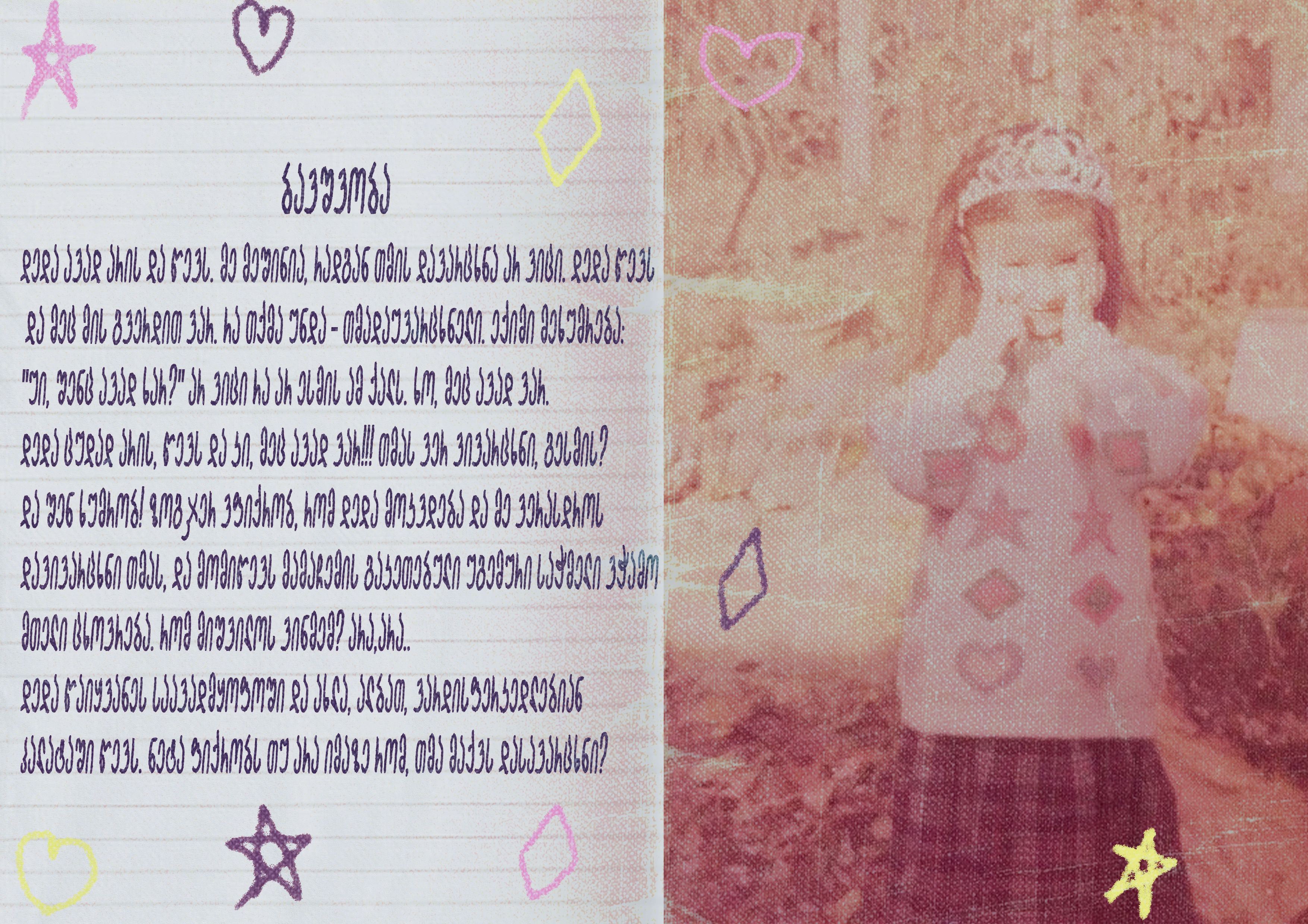 დედა ავად არის და წევს. მე მეშინია, რადგან თმის დავარცხნა არ ვიცი. დედა წევს და მეც მის გვერდით ვარ. რა თქმა უნდა - თმადაუვარცხნელი. ექიმი მეხუმრება: "უი, შენც ავად ხარ?" არ ვიცი რა არ ესმის ამ ქალს. ხო, მეც ავად ვარ. დედა ცუდად არის, წევს და კი, მეც ავად ვარ!!! თმას ვერ ვივარცხნი, გესმის? და შენ ხუმრობ! ზოგჯერ ვფიქრობ, რომ დედა მოკვდება და მე ვერასდროს დავივარცხნი თმას, და მომიწევს რომ მამაჩემის გაკეთებული უგემური საჭმელი ვჭამო მთელი ცხოვრება. რომ მიშვილოს ვინმემ? არა,არა.. დედა წაიყვანეს საავადმყოფოში და ახლა, ალბათ, ვარდისფერკედლებიან პალატაში წევს. ნეტა ფიქრობს თუ არა იმაზე რომ, თმა მაქვს დასავარცხნი?